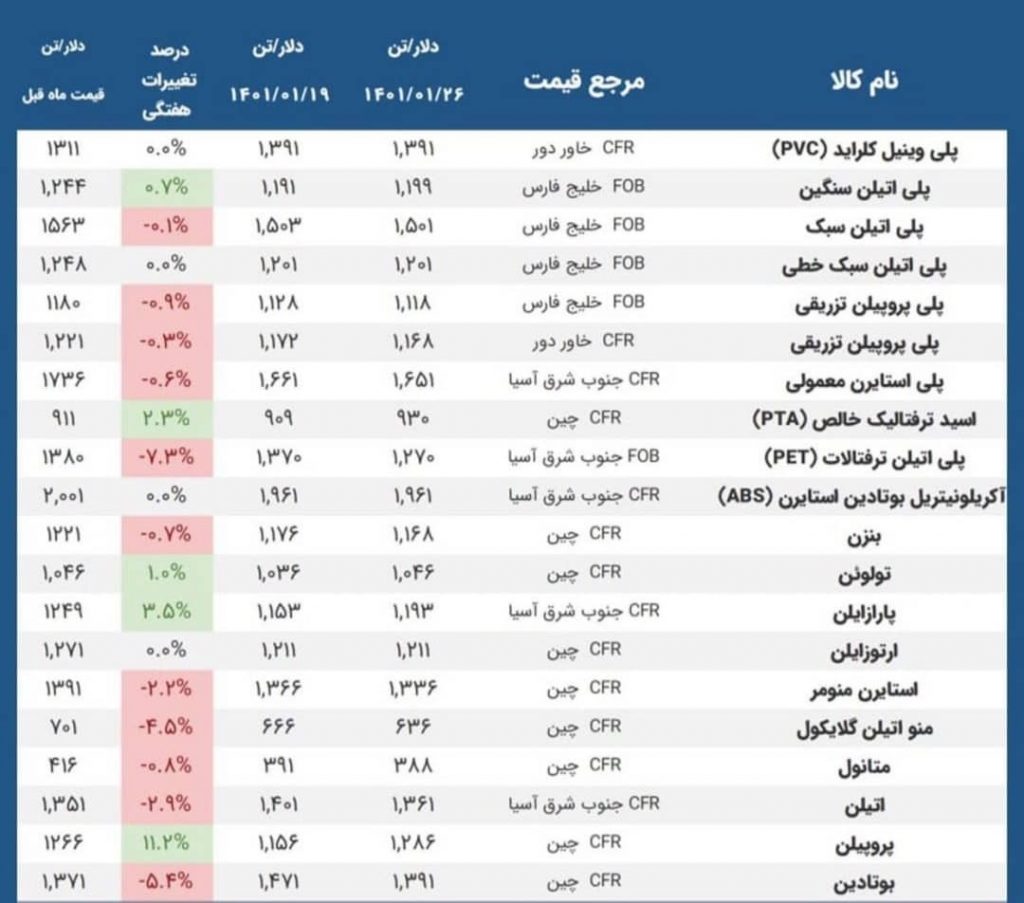 آخرین قیت های منتشر شده پلتس برای محصولات پتروشیمیایی