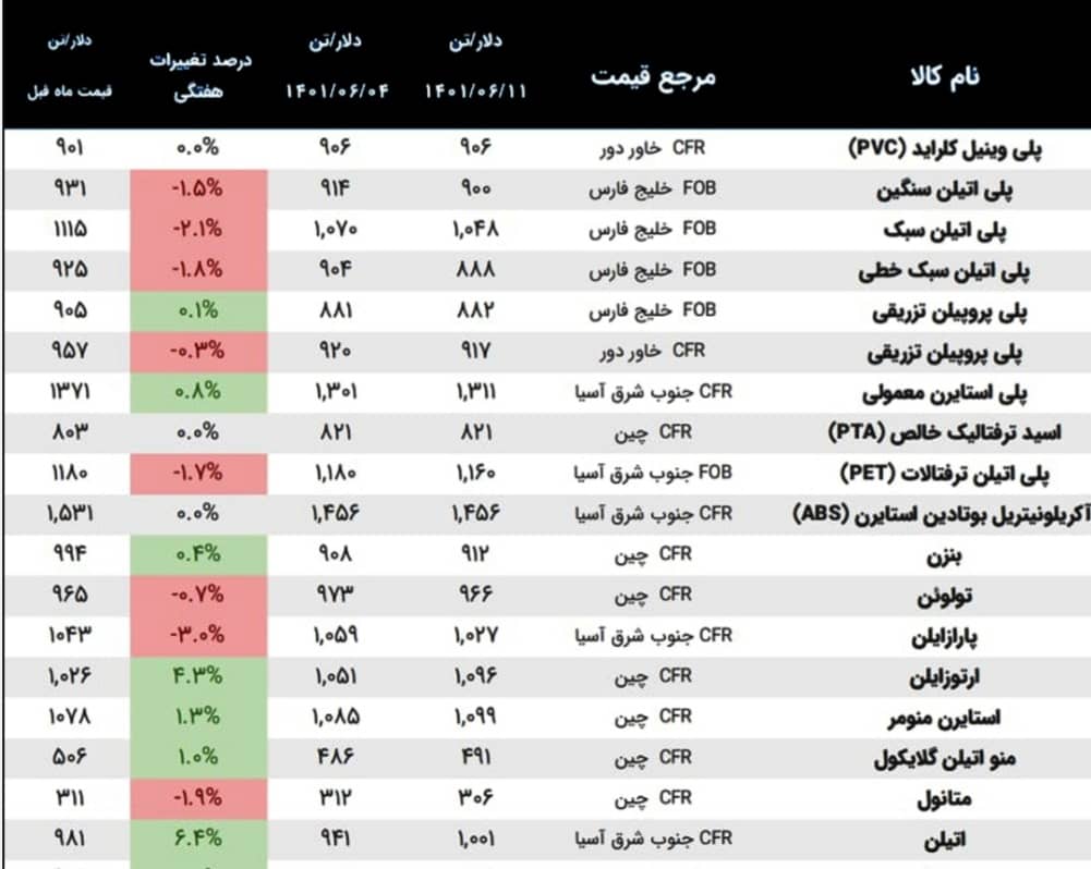 آخرین قیمت های منتشر شده پلتس برای محصولات پتروشیمیایی