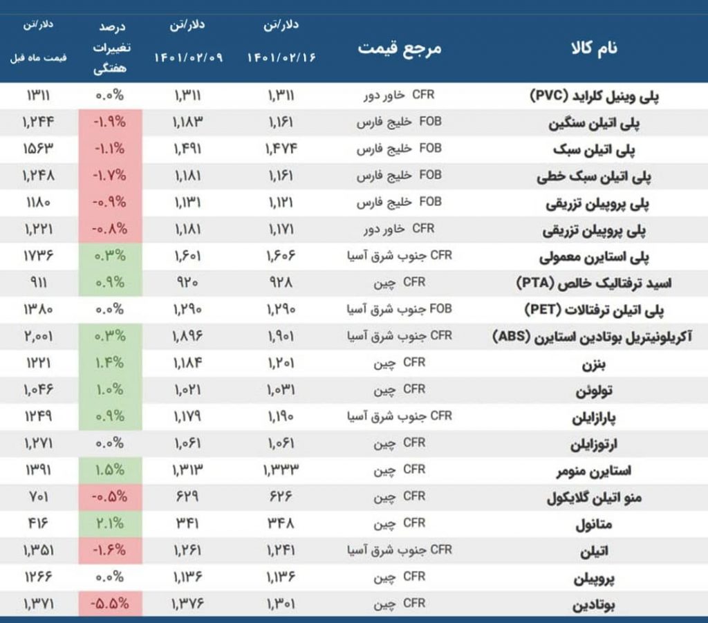 آخرین قیمت های منتشر شده پلتس برای محصولات پتروشیمیایی