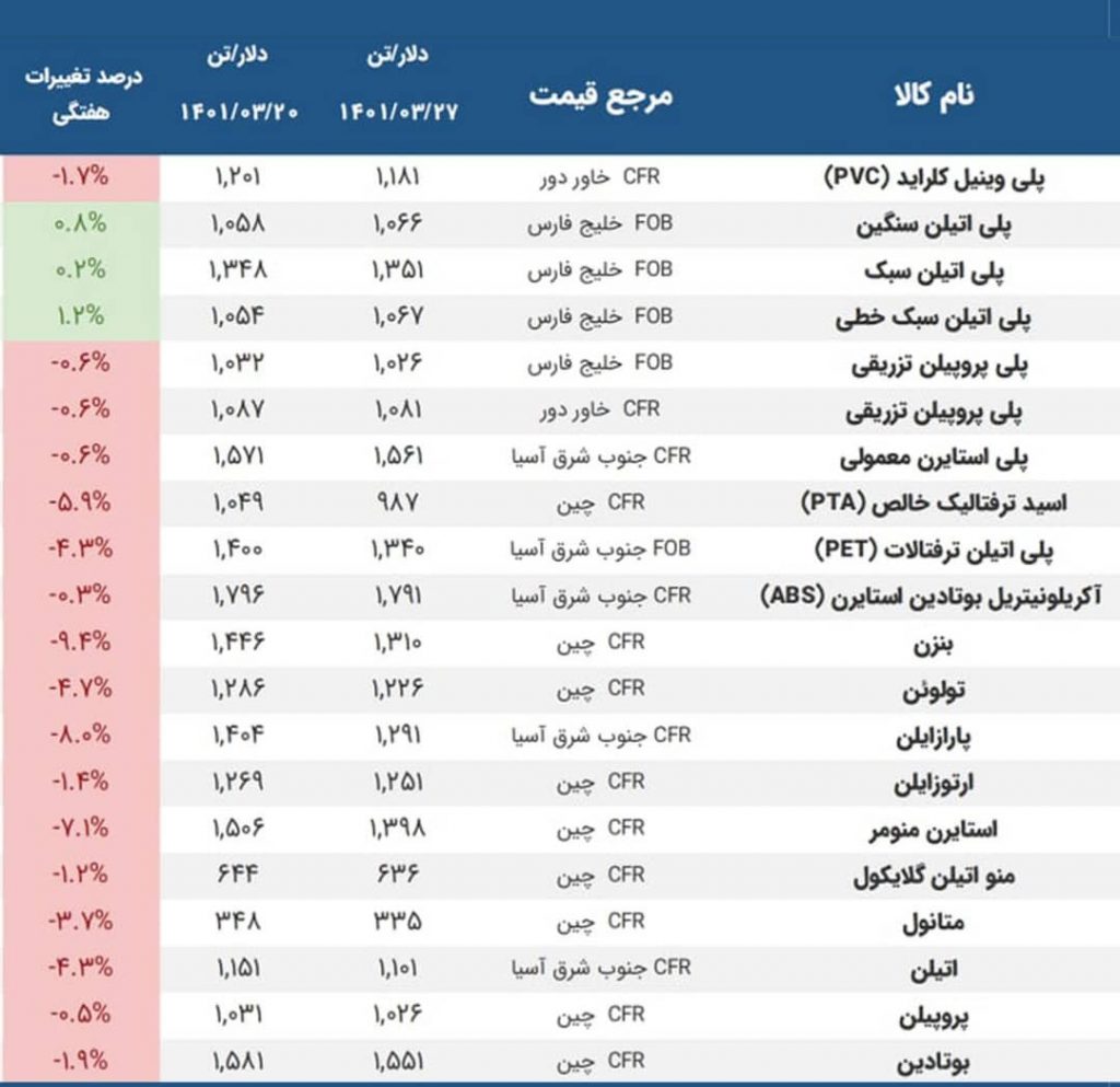 آخرین قیمت های منتشر شده پلتس برای محصولات پتروشیمیایی