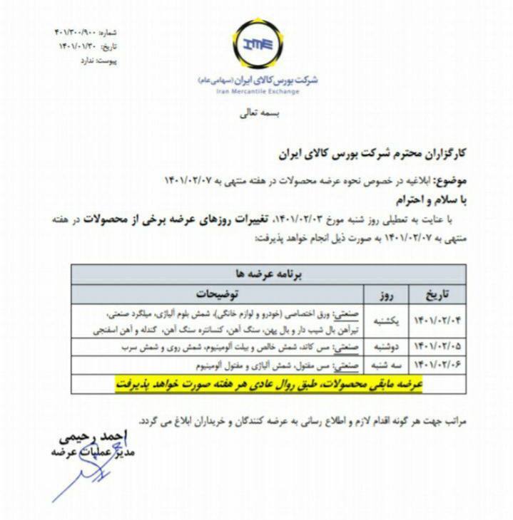 ابلاغیه در خصوص نحوه عرضه در هفته منتهی به ۱۴۰۱/۰۲/۰۷