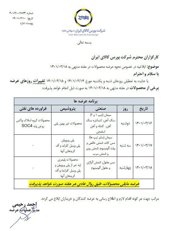 ابلاغیه در خصوصنحوه عرضه محصولات در هفته منتهی ۱۴۰۱/۳/۱۸