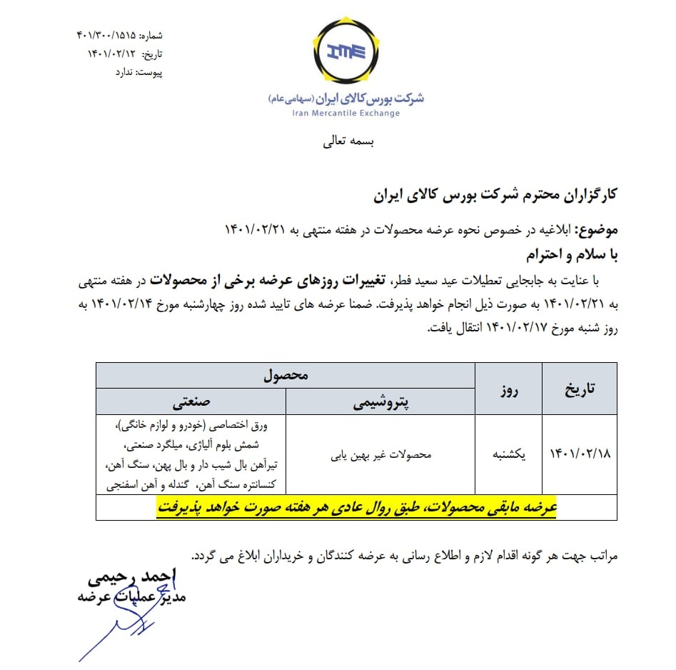 اطلاعیه بورس کالا در خصوص روز های عرضه در هفته آینده، هفته منتهی به ۲۱ اردیبهشت ماه ۱۴۰۱