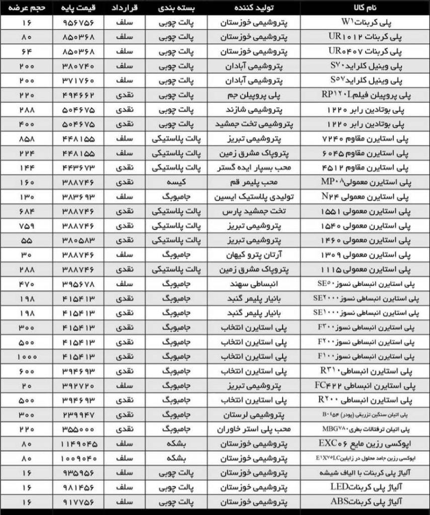 تابلوی عرضه مواد پلیمری در بورس کالا در تاریخ ۱۴۰۱/۲/۱۸