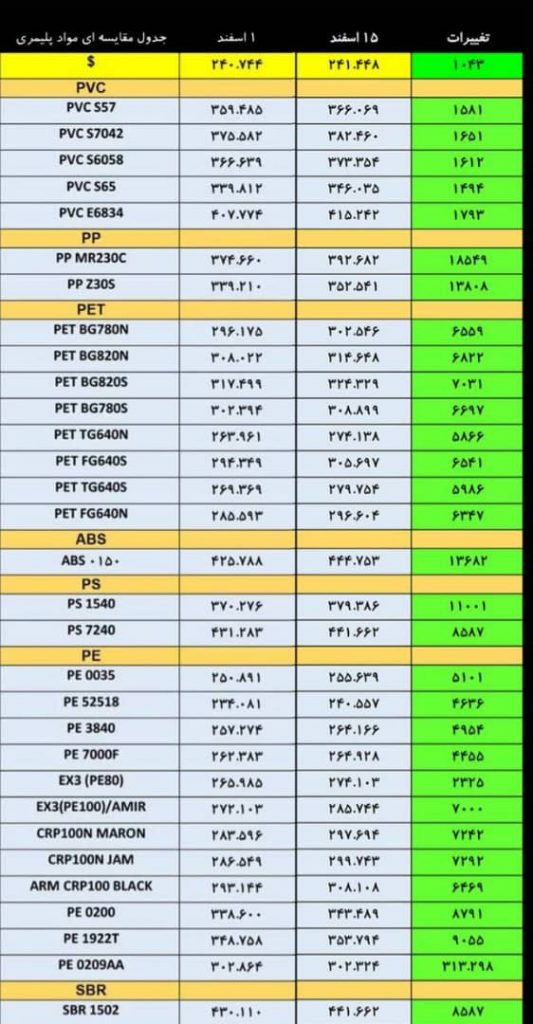 جدول مقایسه ای قیمت مواد پلیمری ۱۵ و ۸ اسفند ۱۴۰۰