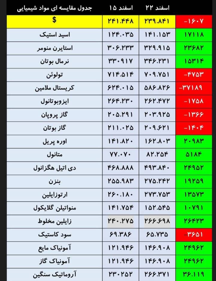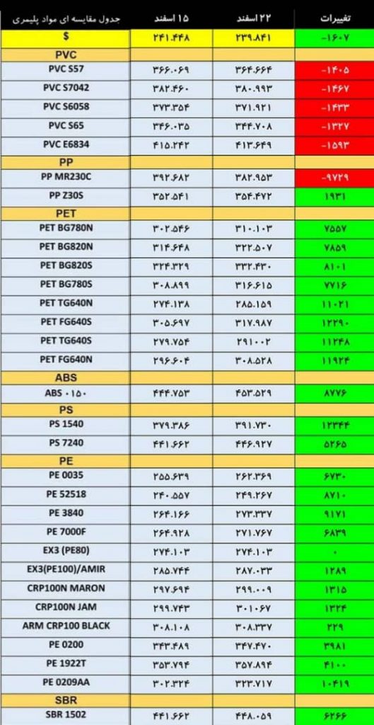 جدول مقایسه ای قیمت مواد پلیمری در ۱۵ و ۲۲ اسفند ماه ۱۴۰۰