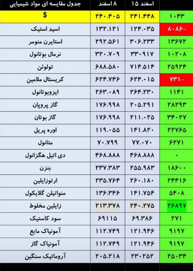 جدول مقایسه ای قیمت پایه محصولات شیمیایی در تاریخ های ۱۵ و ۸ اسفند ۱۴۰۰