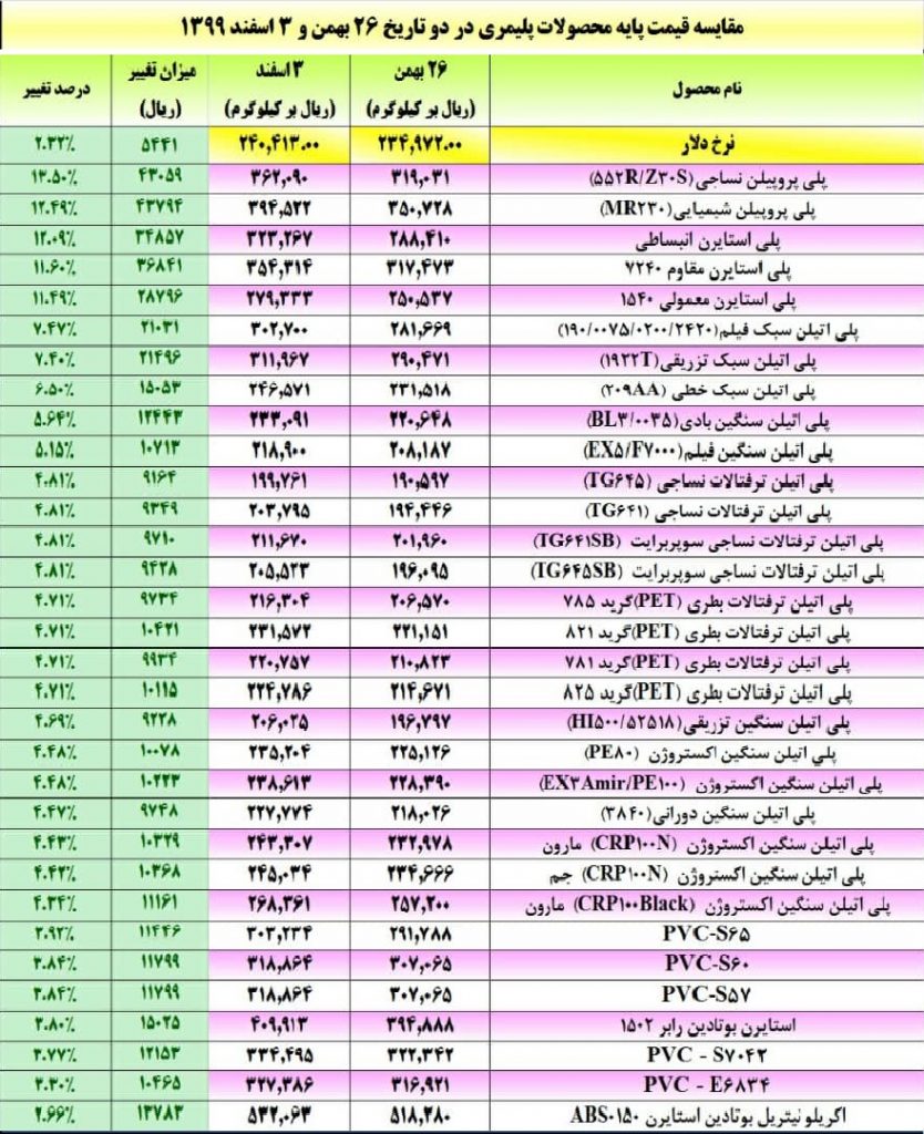 میانگین هفتگی دلار نیمایی برای محاسبه قیمتهای پایه محصولات پتروشیمی در روز یکشنبه ۲۶ بهمن ماه ۲۳۴٫۹۶۲ ریال بود و طی این هفته با ۵٫۴۵۱ ریال افزایش به ۲۴۰٫۴۱۳ ریال در تاریخ یکشنبه ۳ اسفند رسید که نشان از افزایشی حدود از ۲٫۳۱ درصد دارد.