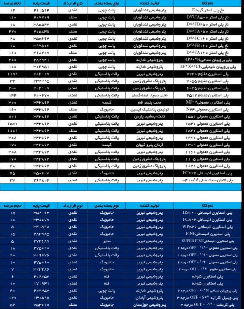 آخرین قیمت های منتشر شده پلتس برای محصولات پتروشیمیایی