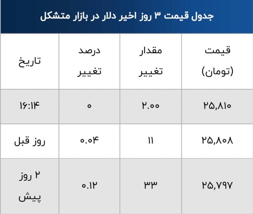 دلار در بازار متشکل امروز  به ۲۵,۸۱۰ (بیست و پنج هزار و هشتصد و ده ) تومان رسید.