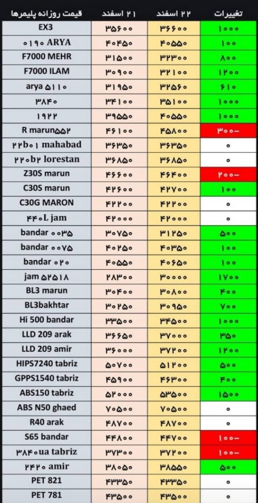 قیمت مواد پلیمری در تاریخ ۱۴۰۰/۱۲/۲۲