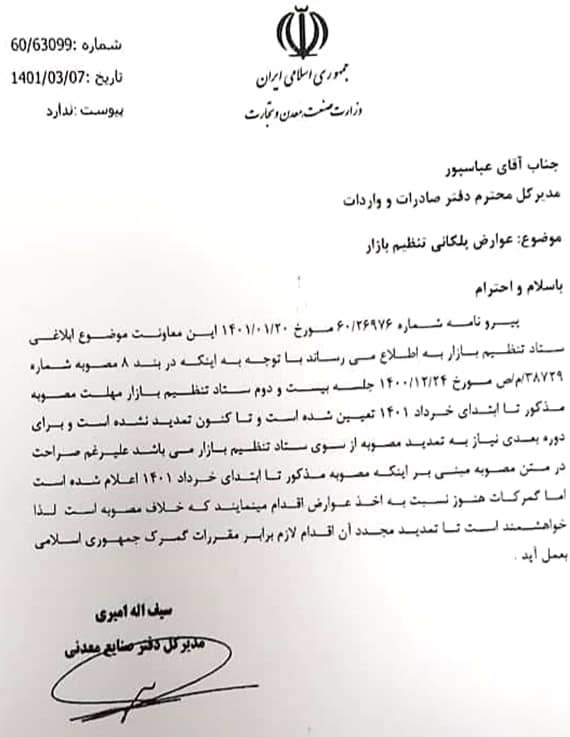 اقدام گمرک در خصوص دریافت عوارض صادراتی بعد از اول خرداد ۱۴۰۱ فاقد سند قانونی بالادست می باشد موضوع از سوی صمت به اطلاع گمرک نیز رسیده است