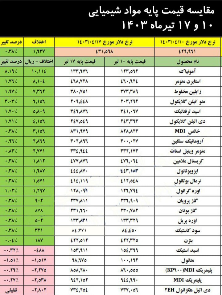 مقایسه قیمت پایه مواد شیمیایی ۱۰ و ۱۷ تیر ۱۴۰۳