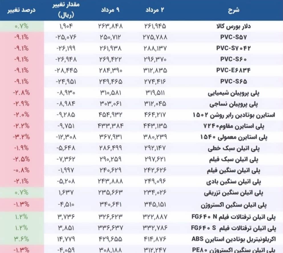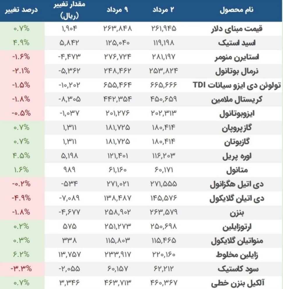 مقایسه محصولات پتروشیمی در تاریخ های ۲ و ۹ مرداد ۱۴۰۱
