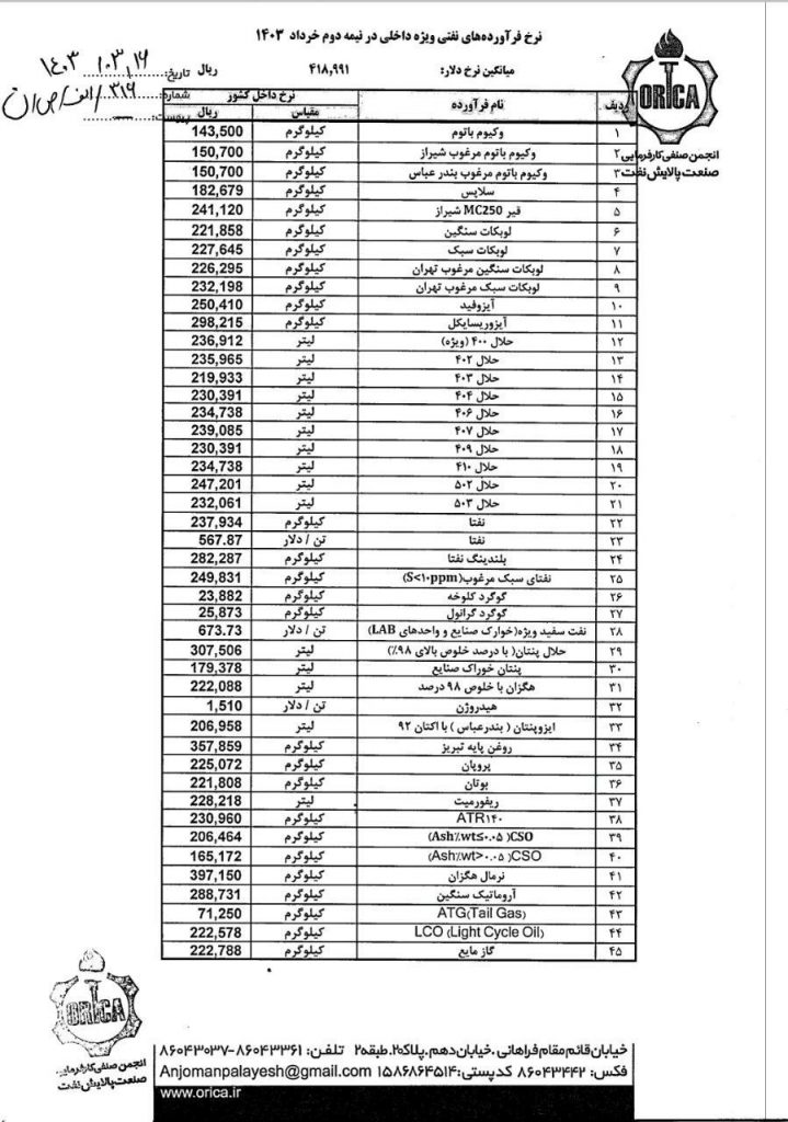 نرخ فرآورده های نفتی ویژه داخلی و صادراتی در نیمه دوم خرداد ماه