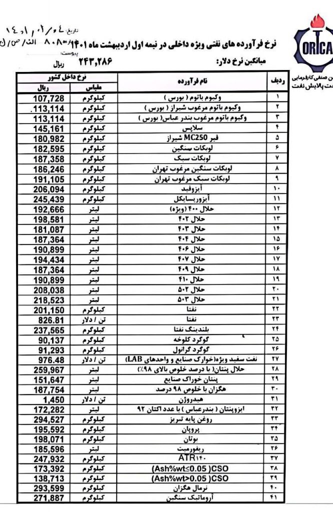نرخ فرآورده های نفتی ویژه صادراتی و داخلی